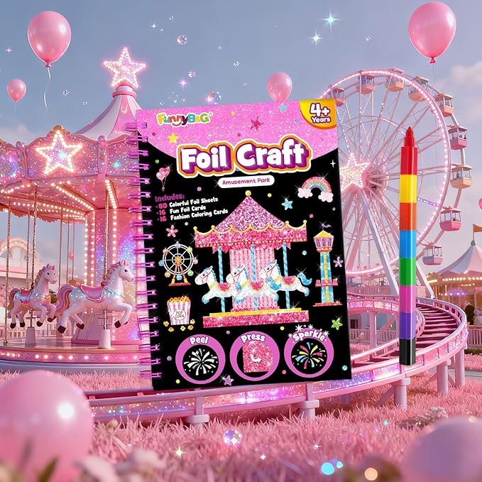 - 🌈Magical Christmas Gifts for Kids:If you are looking for the perfect gift for a child who loves amusement parks, this foil craft kit will be a wonderful surprise.that encourages creativity and artistic exploration.Especially designed for toys for 5 -8 year old kids gifts, Perfect for 4 5 6 year old girl birthday gift,toys for 6 year old girls and boys ,Christmas gifts for grandkids, this set allows children to enjoy crafting and decorating Carousel,Observation Wheel and more,Creating their own unique stories and masterpieces. These are perfect toy for 4 5 6 7 8 year old girlproviding creative entertainment. It comes with everything needed to unleash your child's artistic potential