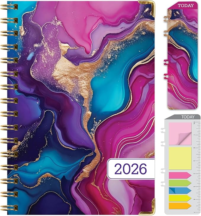HARDCOVER 2026 Planner, 5.5"x8": 14 Months (November 2025 - December 2026), Daily Weekly Monthly Planner, Yearly Agenda, Bookmark, Pocket Folder and Sticky Note Set (Pink Purple Marble)