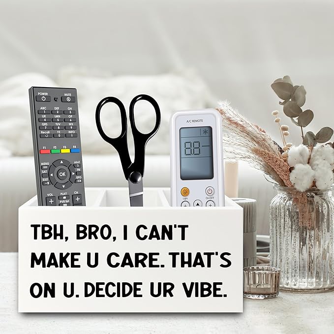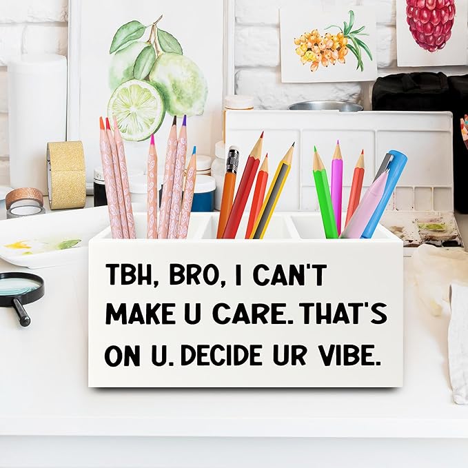 Funny Pen Pencil Holder Organizer for Desk, High School Classroom Decor, Funny Tbh Bro I Can't Make U Care Wooden Box Sign for Home Office Classroom Desk Tabletop Decorations