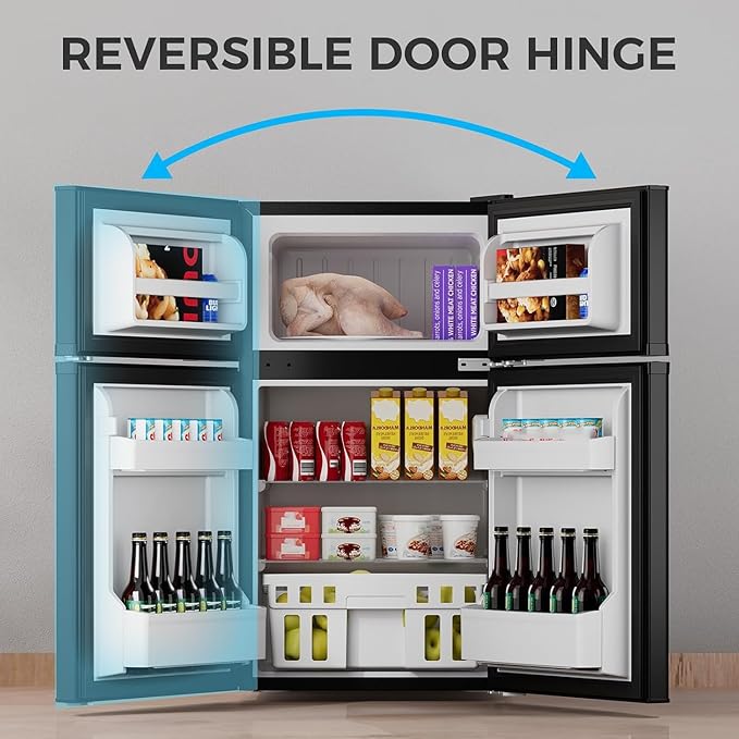 - 【Compact&User-Friendly Design】:Compact&User-friendly Design : This dorm fridge takes up only 2.2 square feet and is perfect for bedrooms, kitchens, dorm rooms,Top of the dorm fridge has reversible hinges, so you can change the opening direction at will. Adjustable glass shelf of fridge makes it more convenient to place taller food or drinks, provides you plenty of flexibility and increasing space utilization.