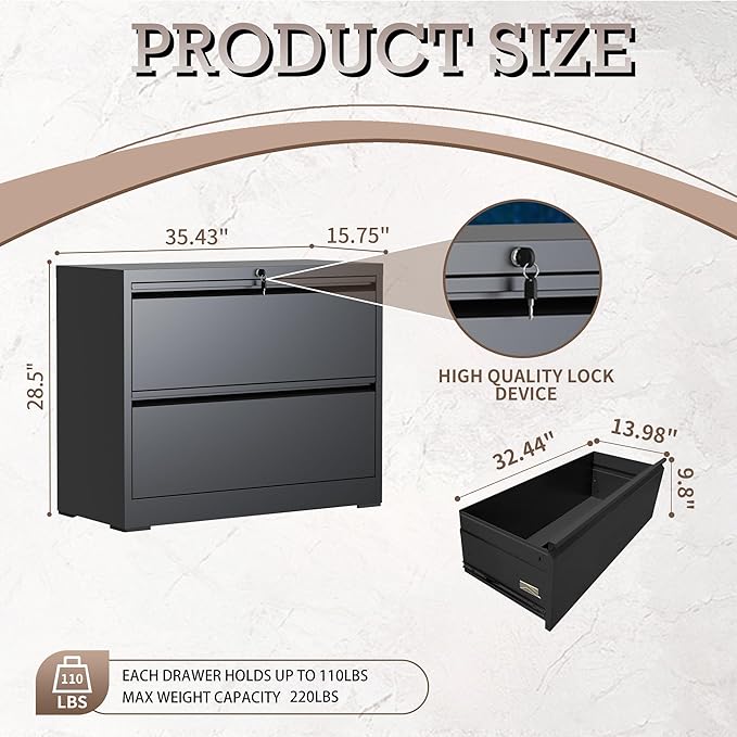 - 【Premium Steel Material】The 2 drawer lateral file cabinet constructed from sturdy cold-rolled steel and with a powder coating process. This filing cabinet offers perfect strength and durability. It reliably protects your important files from damage and is built to withstand daily use for several years to come.