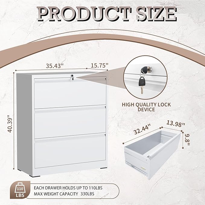 - 【Premium Steel Material】The 3 drawer lateral file cabinet constructed from sturdy cold-rolled steel and with a powder coating process. This filing cabinet offers perfect strength and durability. It reliably protects your important files from damage and is built to withstand daily use for several years to come.