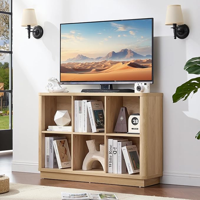 - MULTIPURPOSE: This 2-tiered 2 x 3 bookcase serves as both a modern bookcase for storing large collections of books and displaying collectibles, and as a TV stand for the living room or console table for the entryway. Carefully crafted rounded corners effectively reduce the risk of injury from accidental collisions. You'll find the perfect spot for it anywhere in your home.