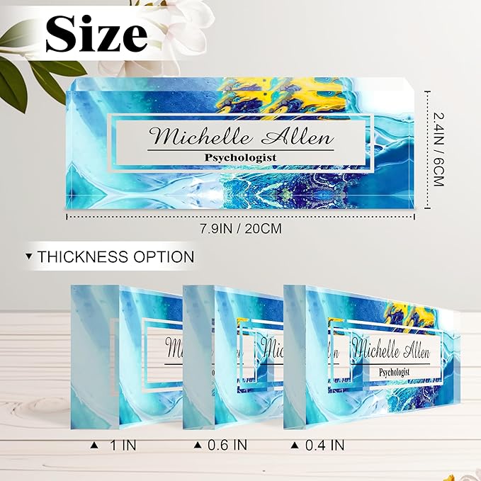 - Professional Customized Name Plate: With just three simple steps, you can have this exquisite professional name plate. Select your style and thickness, then enter the custom information(Name/Position/Blessing) to complete your custom order. We use efficient production and meticulous quality inspection to ensure that you receive this desktop name plate in a timely manner. Take immediate action to add a touch of brightness to your office space!