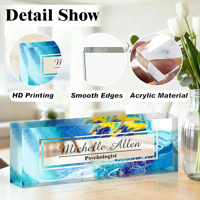 - Personalized Desk Name Plate: We employ advanced UV-cured ink printing technology to ensure text and patterns remain as vibrant as new, resistant to wear, fading. The edges are polished with precise rounded corners, providing a smooth touch without sharp edges Crafted from premium high-density acrylic material, it boasts crystal-clear transparency, enduring luster, and resistance to yellowing, maintaining its pristine clarity and visual brilliance long after long term use.