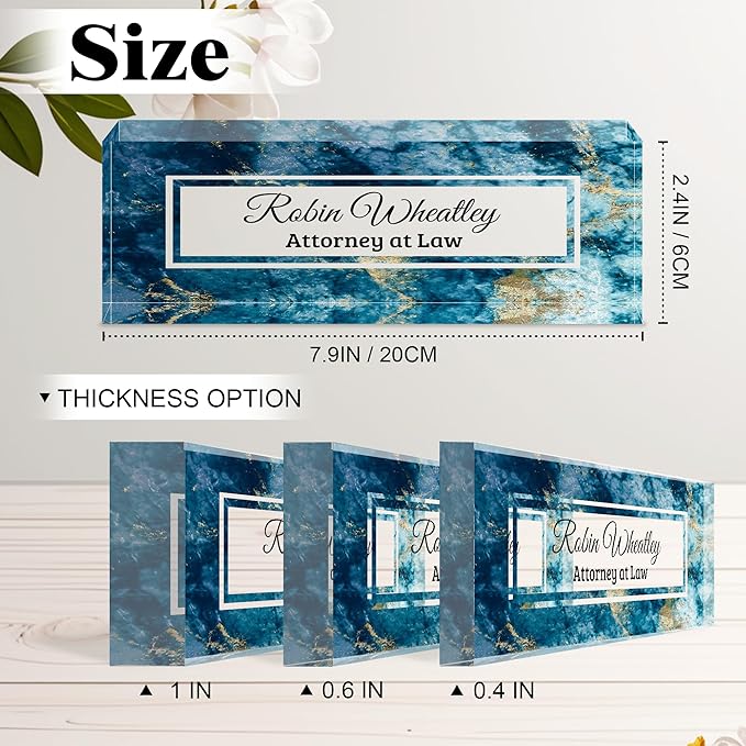 - Professional Customized Name Plate: With just three simple steps, you can have this exquisite professional name plate. Select your style and thickness, then enter the custom information(Name/Position/Blessing) to complete your custom order. We use efficient production and meticulous quality inspection to ensure that you receive this desktop name plate in a timely manner. Take immediate action to add a touch of brightness to your office space!