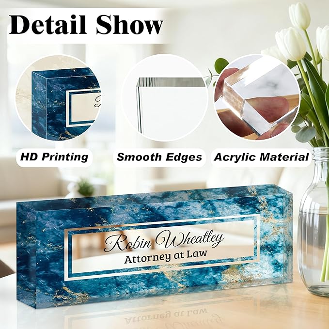 - Personalized Desk Name Plate: We employ advanced UV-cured ink printing technology to ensure text and patterns remain as vibrant as new, resistant to wear, fading. The edges are polished with precise rounded corners, providing a smooth touch without sharp edges Crafted from premium high-density acrylic material, it boasts crystal-clear transparency, enduring luster, and resistance to yellowing, maintaining its pristine clarity and visual brilliance long after long term use.