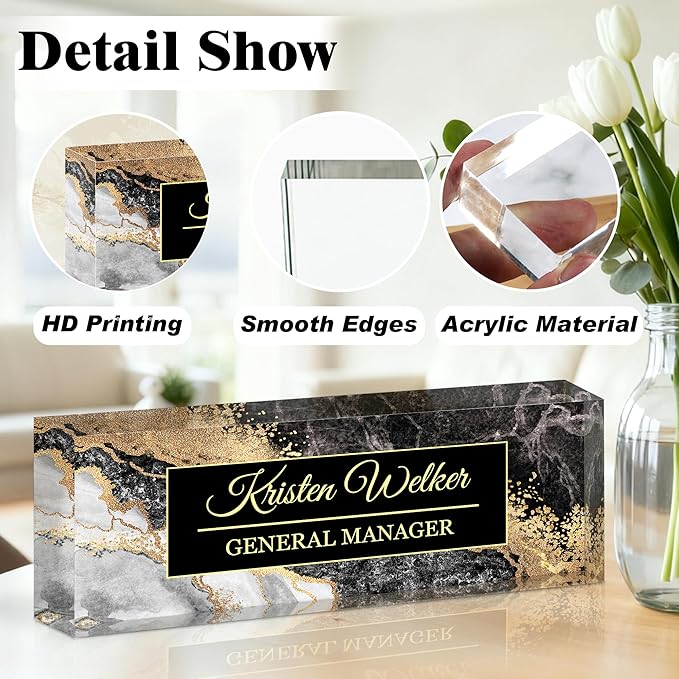 - Personalized Desk Name Plate: We employ advanced UV-cured ink printing technology to ensure text and patterns remain as vibrant as new, resistant to wear, fading. The edges are polished with precise rounded corners, providing a smooth touch without sharp edges Crafted from premium high-density acrylic material, it boasts crystal-clear transparency, enduring luster, and resistance to yellowing, maintaining its pristine clarity and visual brilliance long after long term use.