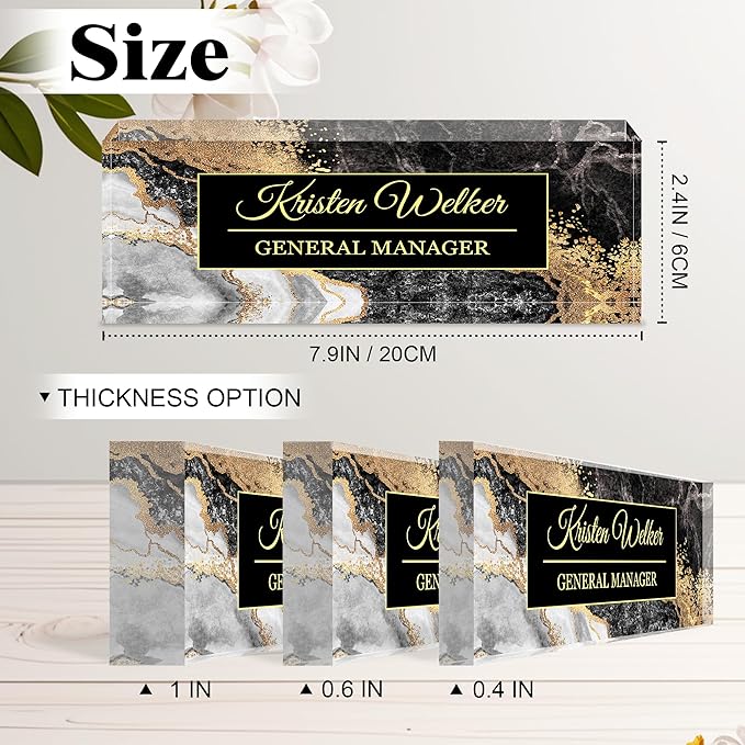 - Professional Customized Name Plate: With just three simple steps, you can have this exquisite professional name plate. Select your style and thickness, then enter the custom information(Name/Position/Blessing) to complete your custom order. We use efficient production and meticulous quality inspection to ensure that you receive this desktop name plate in a timely manner. Take immediate action to add a touch of brightness to your office space!