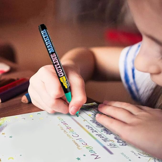 - 【Double Line Metallic Shimmer Markers】The outline shimmer markers feature 12/18 vibrant metallic colors and a unique double line design, enabling you to create dual-color outlines in one stroke. Achieve 3 different effects on light paper, black paper, and smooth surfaces—perfect for adding shimmer to any art project.