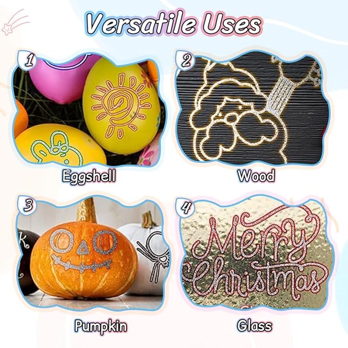 - 【Wide Application】Double line glitter marker pens can be used for DIY crafts, card making, scrapbooking, coloring, holiday decorations, and more. They work on pottery, wood, glass, plastic, metal, stone, and other surfaces, making them versatile for all kinds of creative projects.