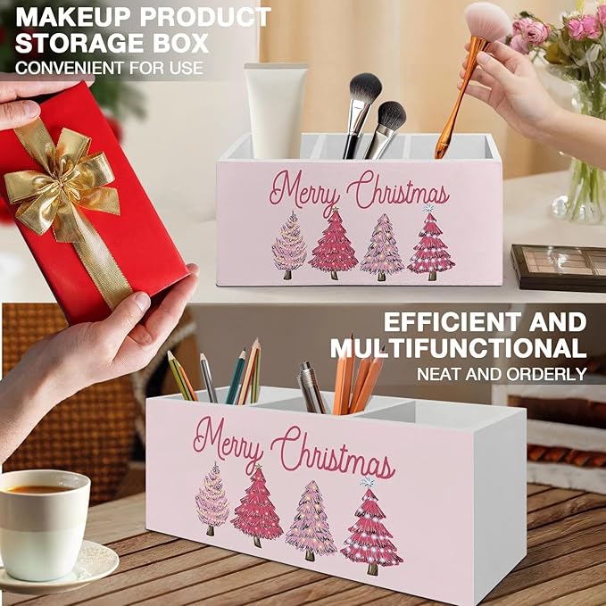 Pink Merry Christmas Tree Pen Pencil Holder Organizer for Desk Accessories, Pink Pencil Holder, Preppy Girly Xmas Wooden Box Signs Decorations for Home Office Desk Tabletop