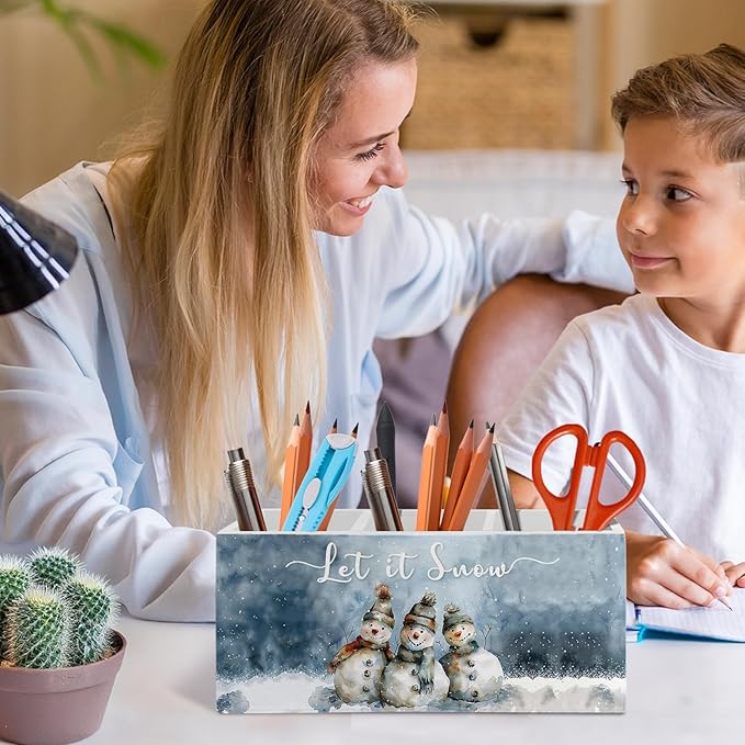 Winter Christmas Snowman Pen Pencil Holder Organizer for Desk Accessories, Snowman Gifts, Snow Rustic Christmas Wooden Box Signs Decorations for Home Office Desk Tabletop