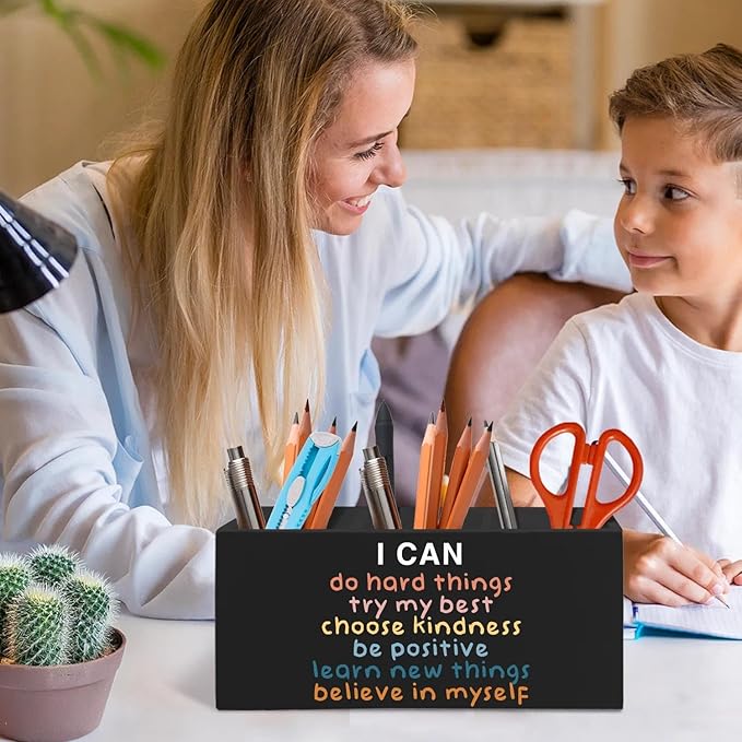 Inspirational Pen Pencil Holder Organizer for Desk Accessories, Boho Classroom Decor, I Can Do Hard Things Motivational Wooden Box Signs Decorations for Counseling Office Desk Tabletop