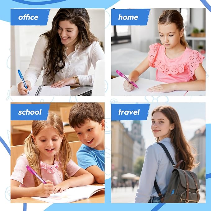 - Instant Error Correction: Featuring an integrated eraser tip made from durable, non-abrasive thermoplastic material, these pens let you correct typos and redraw lines instantly without harming paper fibers. Simply rub gently to lift away unwanted ink and write again on the clean surface. This function eliminates messy cross-outs and reduces wasted pages, helping you maintain neat, polished notes and documents. Ideal for precise, on-the-go edits in planners, journals, and reports
