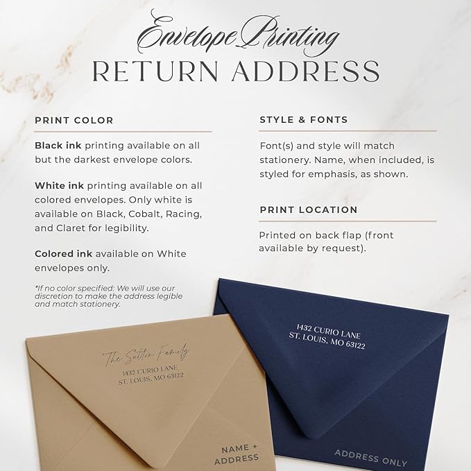 - CUSTOMIZED – Choose from our 20 envelope color options to create a truly custom set. Add return address printing for that finishing touch (black ink by default on all but the darkest envelopes—claret, racing, walnut, cobalt & black). White ink is available on super dark envelopes, and color ink is offered on white envelopes by request. Personalize with your family’s name or a festive message to make your Christmas cards special.