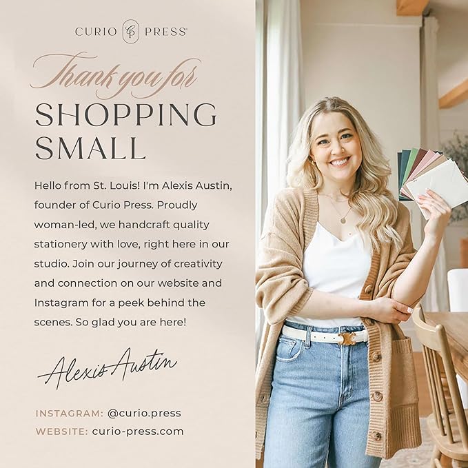 - WOMAN-LED IN USA – Thoughtfully designed and printed by our all-female team in St. Louis, Missouri. We take pride in creating custom stationery cards and personalized note cards for women, men, and families alike. From custom thank you cards with envelopes to personalized stationery with envelopes, each piece is crafted with care. Trust Curio Press to provide high-quality, beautifully personalized holiday cards and stationery.