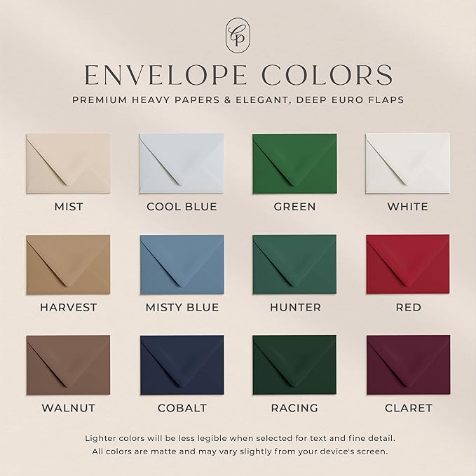 - PREMIUM QUALITY PAPER & PRINT – Flat printed on premium white, eggshell finish, 110lb Mohawk cardstock for smooth, bleed-free writing. Our pointed Euro-flap envelopes are made from thick, 80-91lb luxury papers. Whether you're sending personalized note cards, thank you cards, or custom cards, our premium paper ensures an elevated feel. Packaged in clear plastic boxes for easy storage, our cards are ready to impress your loved ones or clients.