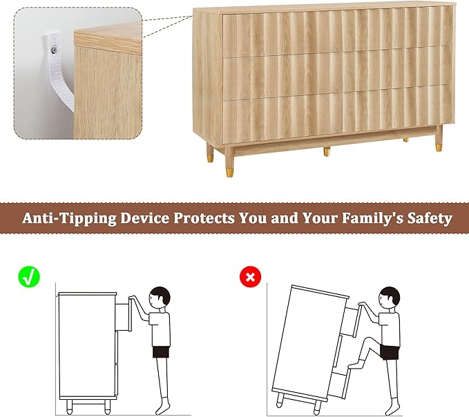 - Safe and Stable:This modern 6 drawer dressers composed of high-quality MDF, providing good stability and support. Featuring convenient Rebound Devices, each drawer opens and closes smoothly with just a gentle press, offering effortless access. It is also equipped with an anti-tilt safety belt to firmly fix the dressing table to the wall, preventing accidental tilting and enhancing safety. This combination of smooth operation and secure anchoring represents an important security upgrade, especially for families with children or pets