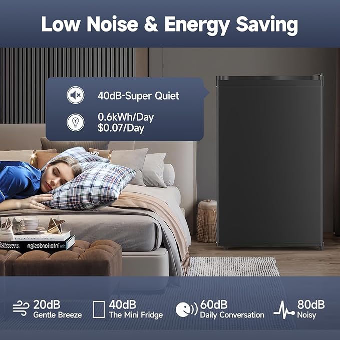 - Quiet & Energy Saving: Operating at just 40 dB and using only 0.6 kWh per day, this mini fridge is whisper-quiet and energy-efficient. Ideal for use in bedrooms, study areas, or quiet office spaces where noise and power consumption matter